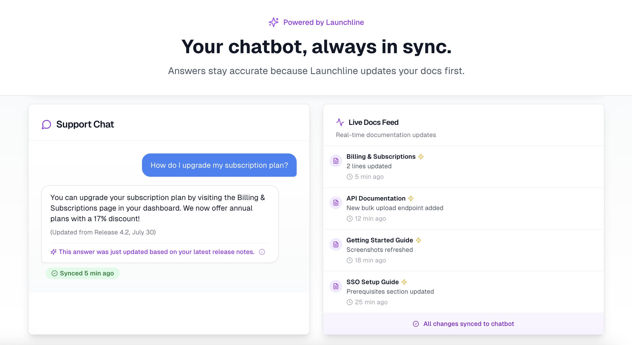 When your product changes, Launchline updates your docs — and your chatbot’s answers — instantly.